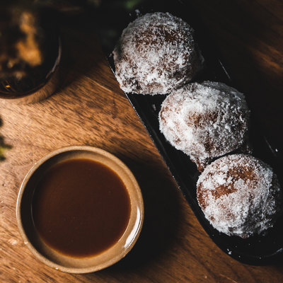 szechuan pepper begniet, sugar dusting, salted caramel and miso sauce